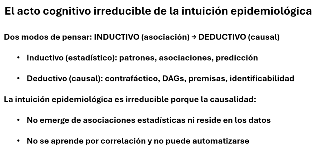 La epidemiología siempre ha combinado dos modos de pensar: el inductivo, que detecta patrones en los datos, y el deductivo, que articula supuestos, causalidad y contrafactuales. Pero el corazón del juicio epidemiológico no está en ninguno de los dos, sino en la capacidad humana de saber cuándo cambiar de uno al otro. Ese cambio de modo —ese acto cognitivo irreducible— no está en los datos ni en los algoritmos. Y por eso, aunque la IA acelera el análisis, no puede reemplazar el juicio.