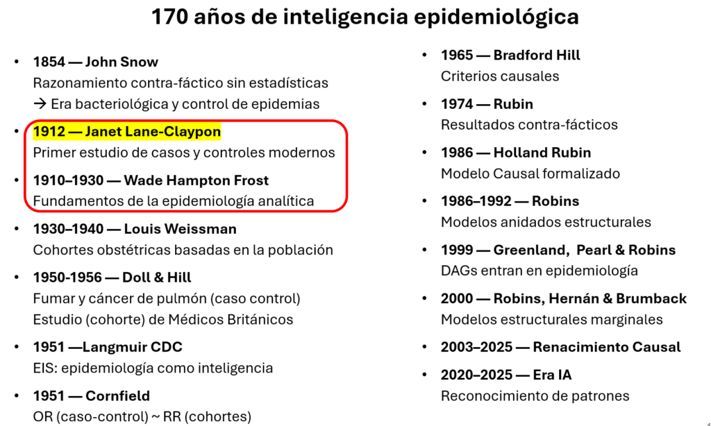 Bacteriología; Janet Lane-Claypon introduce casos y controles; Frost formaliza lógica de cohortes.